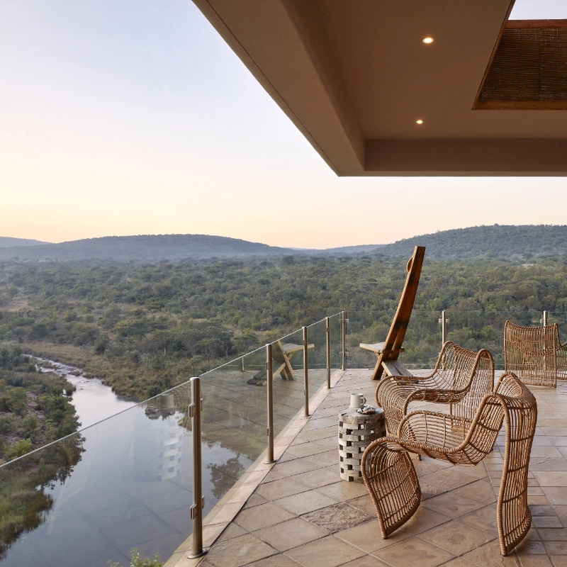 Perched dramatically on a cliff face, Matomo Safari Lodge blends seamlessly with its natural surroundings. Expertly crafted from locally sourced stone and featuring elegant, high-end interior finishes, the lodge offers uninterrupted views over a tranquil dam and the breathtaking South African Bushveld. This intimate and exclusive setting immerses guests in the raw beauty of the wilderness, delivering a truly unforgettable luxury safari experience.